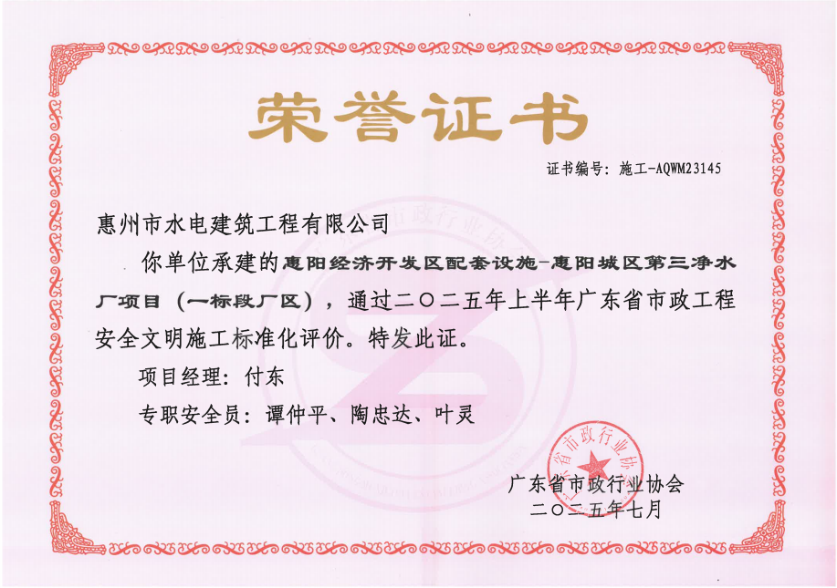 近日,廣東省市政行業(yè)協(xié)會傳來喜訊,由我司承建的惠陽經(jīng)濟開發(fā)區(qū)配套設(shè)施—惠陽城區(qū)第三凈水廠項目(一標(biāo)段廠區(qū)),順利通過2025年上半年“廣東省市政工程安全文明施工標(biāo)準化”評價。……
